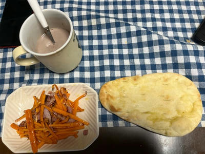 いつかの朝食か昼食。ナンにバターを塗ってトースターで焼いて、ニンジンとベーコンの炒めと。