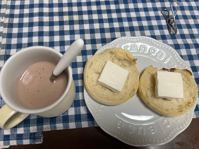 いつかの朝食。イングリッシュマフィンをトースターで焼いてクリームチーズをのせてます!豆乳ココアと共に。