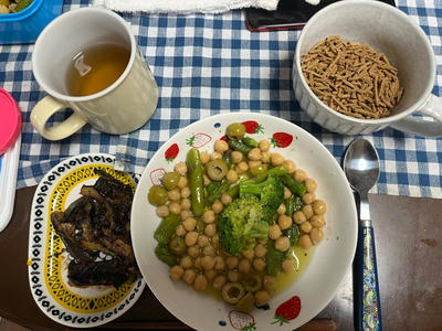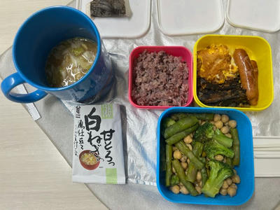 昼食。お弁当を作って、温野菜サラダの残りとナスの味噌炒め、ブランフレーク。