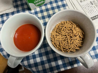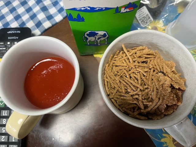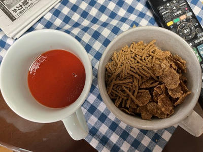 いつかの朝食。ブランフレークのコーンフレーク形状のものに普通のブランフレーク混ぜ、トマトジュース。