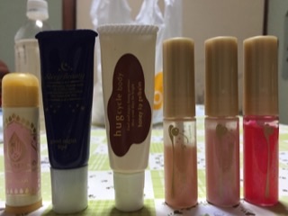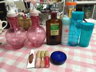写真カブってるやつもありますが、シャンプー・リンスのボトル、加美乃素(髪が早く伸びる養毛剤)、日焼け止めスプレー缶、化粧水・乳液のボトル、リップクリーム・グロス類(グロスは残ってますが、いつ買ったっけ…系なので(ノ∀`)タハー)、パウダーです。