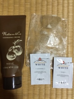 メイク落としクリームの容器、固形ボディオイルの入っていた袋、サンプルのクレンジングと洗顔。