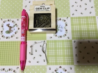 制汗剤、書けなくなってかなり経っていたペン、iPhoneを開けるのに使った、変形させたクリップです。