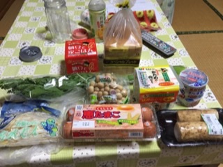 納豆、食パン、セロリ、ブナしめじ、卵、豆腐、シーチキン、もやしです。
