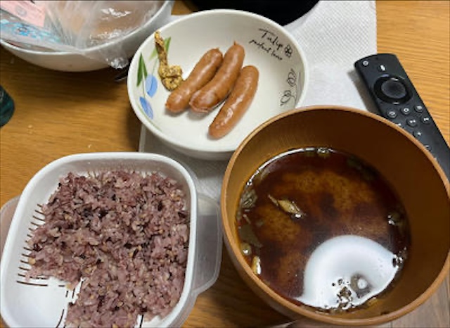 今日の朝ごはんは、雑穀米、インスタント味噌汁、ウインナー。タンパク質取らねば…(๑•̀ㅂ•́)و✧グッ!