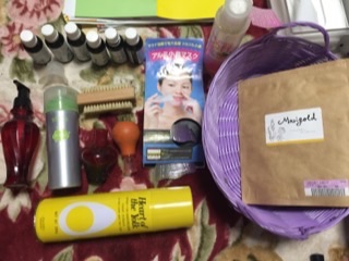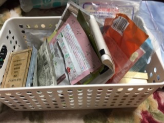 カゴ1個目。あとちょっとで使い終わるマッサージオイル、除光液を残して断捨離。