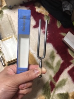 コレ、何だかご存知ですか?o(*゚▽゚)o~ウキウキ♪♬音叉と言います。楽器をチューニングする時なんかに使うんですが、二胡を買った大学生の時、買ったのでした。楽器店のお兄さんに使い方を聞いたらば、「鳴らすと、ん~(ラの音色)って鳴るんですよ!☆(ゝω・)v」とノリノリで教えてくれたので、便利なチューナーではなくコチラを買っちまったのでした(笑)(๑>؂•̀๑)テヘペロ 二胡まだあるし、コレは残します!