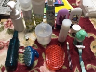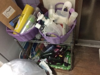 カゴ2つ目は、カビがついてしまったシャンプーブラシ、空になったのに取っといてしまっていたスプレー容器を断捨離。