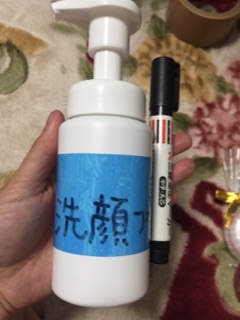 朝使っている、泡で出てくる洗顔フォームは、詰め替えたので容器真っ白なんですよね・・・洗面台に移動させたいけど、実家暮らしなので私の、という、目印をつけたいところです。