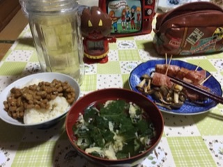 納豆ごはん、長芋ベーコン巻とブナしめじソテー、無印のフリーズドライスープのオクラとモロヘイヤのやつです。
