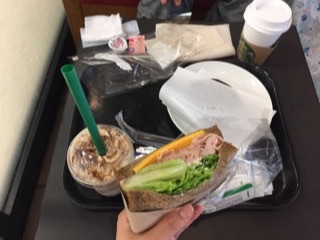 スタバで、オカンはコーヒーとラップサンド、私はナッツのフラペチーノとハニーハムとチェダーチーズのサンドウィッチ。あとチョコクリームドーナツは、ドーナツの中にグルッとチョコクリームが通っていてびびっくりでした!∑(・ω・ノ)ノ