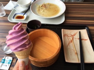 ゆめタウン別府にて、オカンは皿うどんセット、私は釜揚げうどんとか…の残骸と、ミックスベリーソフトです。