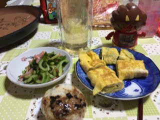 鶏そぼろおにぎり、一部シソ入り卵焼き、セロリとハムの炒め。