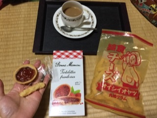 給食チーズというおかき?、ボンヌママンジャムクッキー?、女将さんが入れてくださったコーヒー(ごちそうさまでした!)です。