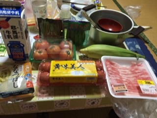 米、豚バラ、牛乳、オクラ、ミニアスパラ、卵、トマト、トウモロコシ。