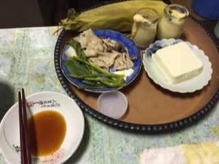 豚バラ、ミニアスパラ、オクラ、ブナしめじ、豆腐、トウモロコシを蒸し器があったので蒸してみました。