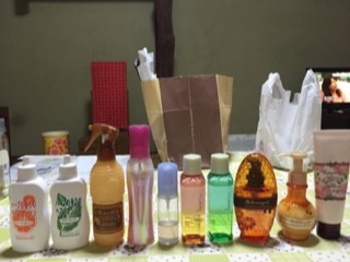 シャンプー、リンスの中には、出発する直前までに使いきれなかったので、比較的小さい容器(薬用シャンプーの緑の容器や、ゴマージュの容器にどうにかこうにか詰め替えたり…(笑))に詰め替えたりしたものも。