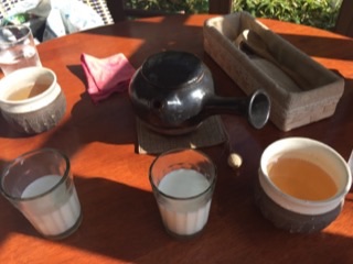 オカンは玄米がゆセット、私はピザセット。塚原?高原というところの、牛乳がついてきました。