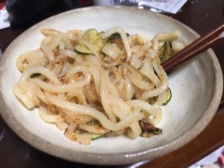 人参の炒め煮、スパムおにぎり、ズッキーニとスパムの焼きうどん。