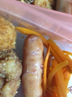 その日の夕飯で食べきれなかった惣菜の唐揚げ、コロッケ、冷凍食品のコーンクリームコロッケ(コロッケ被っとるやないかいっ!Σ\(゚Д゚;))、ウィンナー、人参の炒め煮。2個分できたぞっ(^ω^ ≡ ^ω^)おっおっおっ