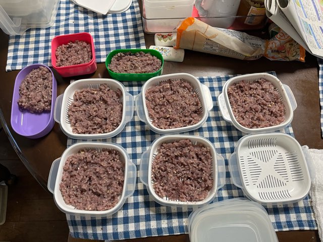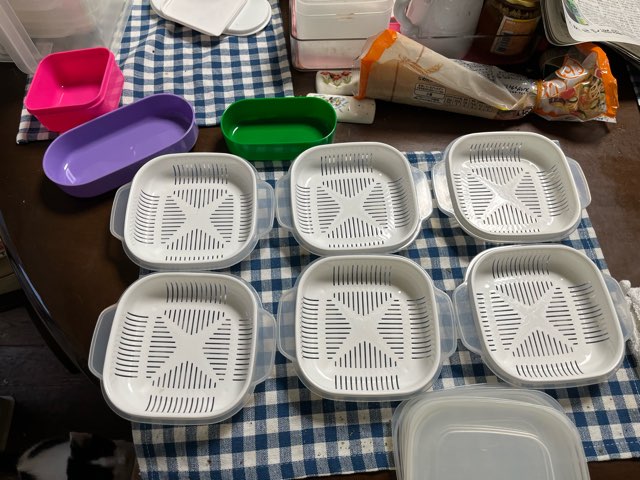 お米を研いで、炊いてる間に保存容器をセッティング。お弁当箱にも何個か入れて冷凍してます。