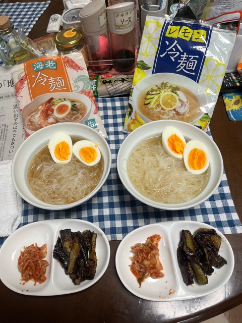 キュウリ、ナスのナムル風、ゆで卵を乗せていただきます。