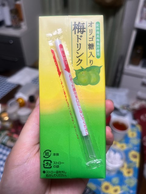 裏面の緑の青梅と葉っぱの絵が青じそに見えて、紫蘇ジュースと思ったけど梅ジュースだったという…(ノ∀`)タハー