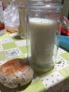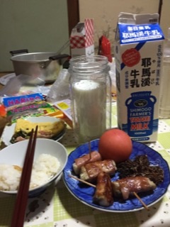 ご飯、卵焼き、セロリとハムの炒め、長芋ベーコン巻き(以上三つのおかずは前作ったやつの残りを冷凍しといたものです)、トウモロコシのヒゲを揚げ焼きにして醤油味にしたもの…こ、焦げました(´;ω;)、そして大分の牛乳です。ご当地牛乳は飲まねば…
