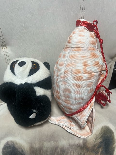 パンダは、高校の修学旅行が中国・北京で、先輩か誰かからのお土産。右はほら貝型のペットボトルカバーなのだった…フェリシモで昔買ったけど使わずじまいだったという(´;ω;`)